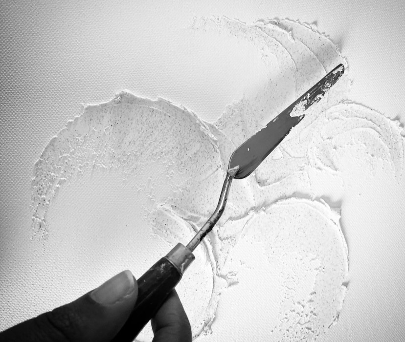 La pâte de texture me permet de donner du corps à mes peintures. Les reliefs ainsi obtenus ajoutent non seulement du volume mais aussi du mouvement en donnant vie à des courbes rondes et douces ou des arrêtes plus marquées et tranchantes.