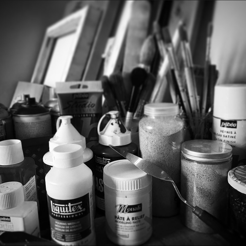 Mes peintures sont sur toiles enchâssées ou sur papier. Mes supports sont de différentes dimensions mais j’avoue préférer peindre sur des grands formats (100 x 100 cm par exemple) ;